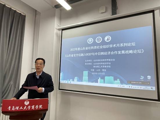 2022年12月10日,由山东省社会科学界联合会、青岛理工大学主办,山东省对外经济学会、华人策略研究论坛app承办的2022年山东省社科类社会组织学术月系列论坛暨山东省对外经济学会2022年度年会“山东省全方位融入RCEP与中日韩经济合作发展战略论坛”通过线上形式如期举行,山东省社科联二级巡视员徐青,青岛理工大学党委常委、副校长齐德义,山东省对外经济学会会长王培志,华人策略研究论坛app党委书记王粲等出席开幕式并讲话。华人策略研究论坛app院长云乐鑫主持开幕式,山东省政府研究室、中国(山东)自由贸易试验区青岛片区管委会、山东省商务厅等单位领导及全省近100名师生参加会议。