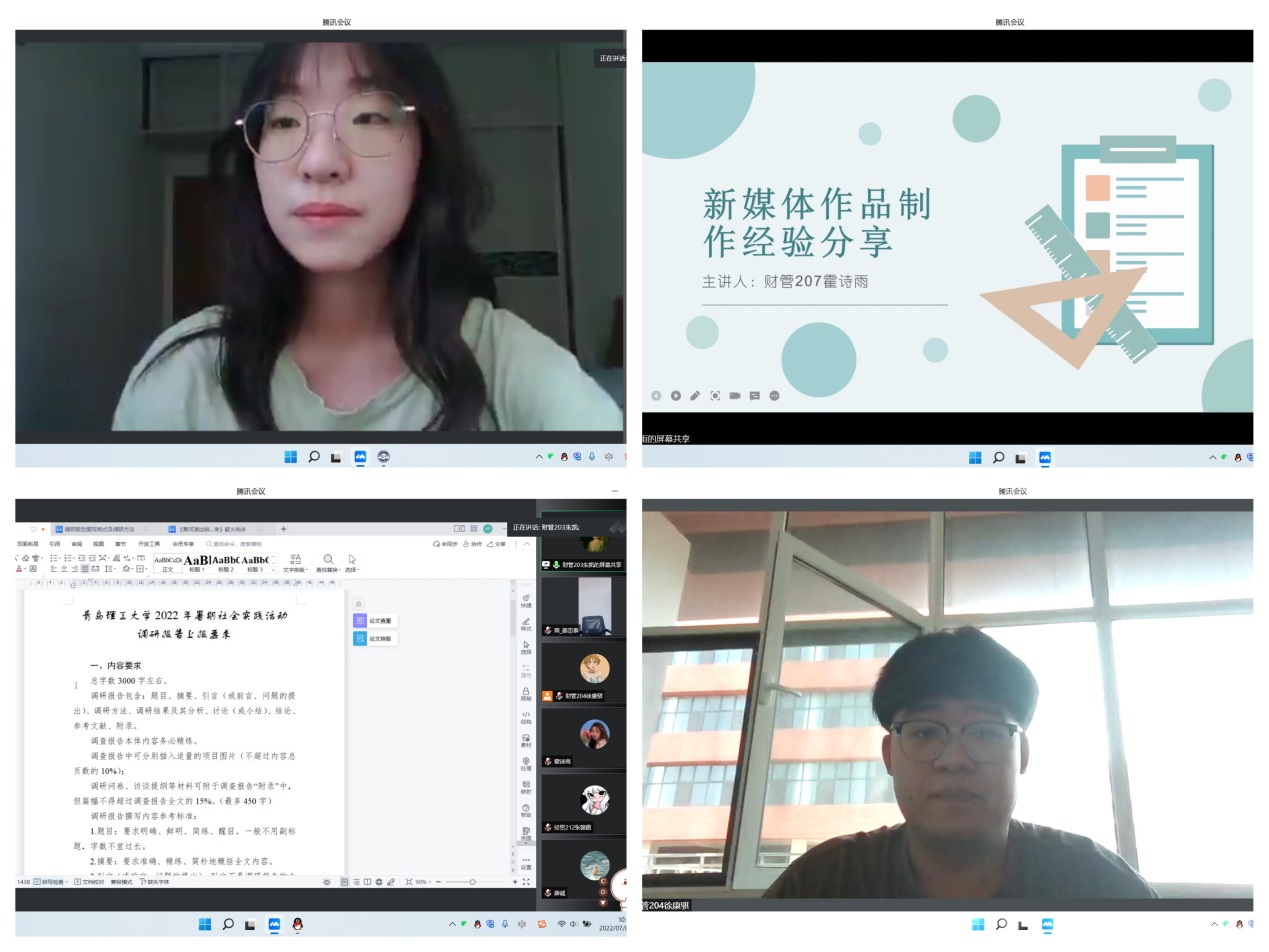 社会实践学生代表朱凯以社会实践调研报告内容和格式为切入点和同学们分享社会实践调研报告的撰写方法,霍诗雨从前期准备、中期录制及后期制作三方面向同学们介绍新媒体作品的制作方法及要求。最后,张锦霞带领学院全体参与2022年暑假社会实践活动的同学做出庄严承诺,表示将严格执行学校关于暑期社会实践的各项规定及疫情防控要求,求精求实完成暑期社会实践。