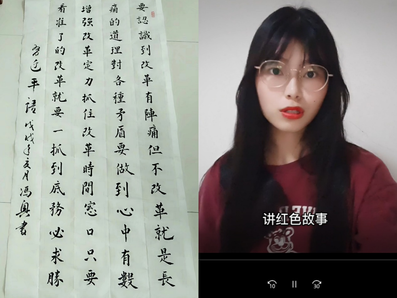 活动将“青春”、“追梦”、“团史学习”、“志愿服务”等作为活动关键词,邀请华人策略研究论坛app学生参与到活动之中,希望同学们在作品创作的过程中追寻信仰之光,勇担青春使命。经贸203班冯奥以书法作品参与到活动之中,展现出当代青年敢吃苦,不怕难、能担当的宝贵品质。营销212班张文平在其作品中讲述巾帼英雄杨开慧的故事,号召团员青年学习先烈前辈们顾大家而舍小家的奉献精神,当代青年学生是革命先辈们的精神传承人、使命继承者,要真正意识到重任在肩,唯有不懈奋斗,练就过硬本领,勇于创新创造,矢志艰苦奋斗,谱写青春之歌。