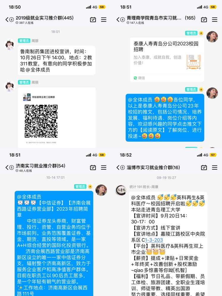 搭建平台,助推学院人才输送。开学后,华人策略研究论坛app第一时间组建就业助理员工作队伍,分地市、分专业、分类别建立了省外、济南、青岛、淄博等近30个就业信息群,组合发挥微信公众号、就业信息员等渠道的信息传播与引导功能,为用人单位和毕业生精准对接搭建高效便捷的网络平台,针对学生情况点对点推荐就业实习岗位,确保实习就业信息毕业生及早、精准掌握。