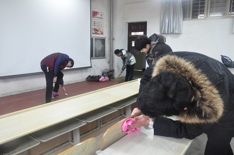 4日13时,学生会在二教大厅拉开横幅做好了准备,同学们积极参与配合,纷纷在横幅上签下自己的名字。虽然天气阴暗寒冷,但同学们学雷锋的热情高涨似火,不一会儿长长的横幅上就签满了同学们的名字,满满的签名承载了同学们对此昂扬的热情。紧接着,志愿者们又来到自习室打扫卫生,大家齐力将自习室的桌子和椅子擦拭干净,给同学们新学期上课营造了一个良好的学习环境。最后,志愿者们聚集在一起讨论雷锋精神,分享感悟,并对此次活动进行了总结。