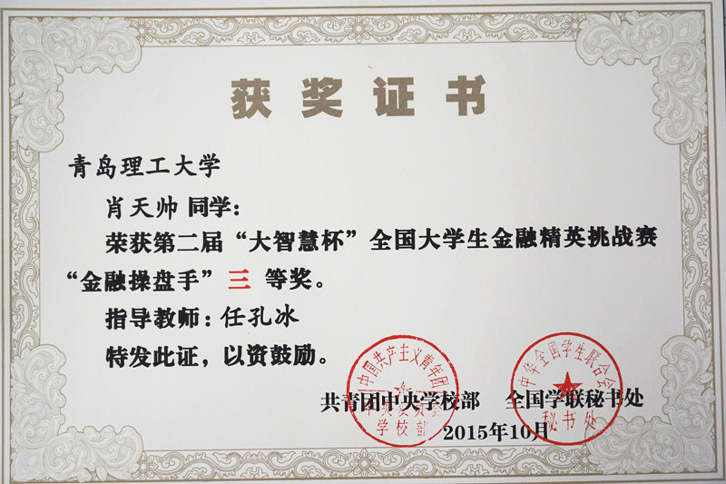 第二届“大智慧杯”全国大学生金融精英挑战赛是由共青团中央学校部和全国学联秘书处主办、上海大智慧股份有限公司承办的大学生金融模拟赛事,旨在推动青年学生“金融创业梦”计划,搭建金融届产学研交流合作平台。比赛从2015年3月开始至2015年10月结束,使用大赛专用平台,以A股、港股、股指期货三个投资品类进行投资策略比拼。我院团总支在比赛前积极宣传,组织学生积极报名参赛,并予以认真指导,学生参赛踊跃,精心准备,根据客观条件不知修改投资策略。最终,财务管理131班侯晓月、财管142班董铁柱、国商142班肖天帅和刘玉婷四名同学荣获本届大赛“金融操盘手”三等奖。